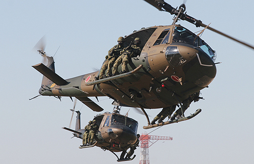 山狗を武装解除させるべく出動した番犬部隊は鷹野を拘束すべくUH1からリペリング(ロープでの降下)で降りた。UH1は1962年から陸自向けのライセンス生産富士重工業で始まり、現在でも使用される汎用輸送ヘリでる。