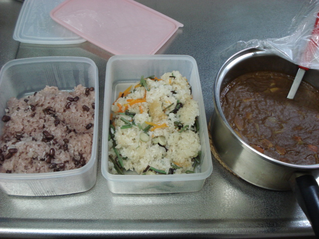 上の画像はIHヒーターの扱い方を業者さんが説明する為に作った料理。カレーに炊き込みご飯・赤飯・カレーに焼きそば・南瓜の煮物・ブロッコリーを茹でたもの。