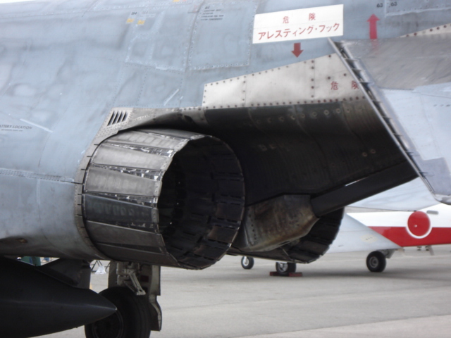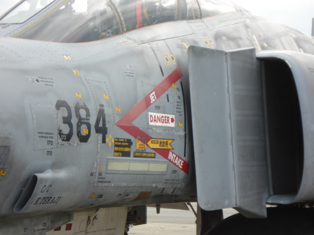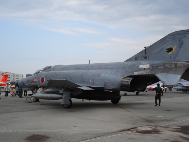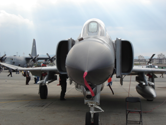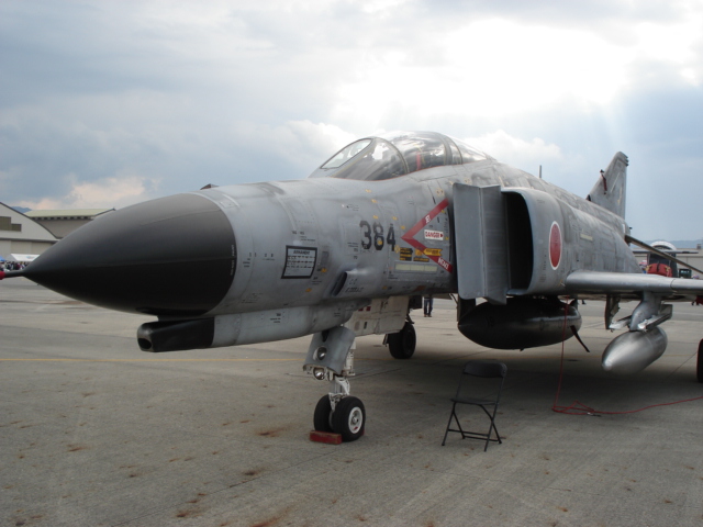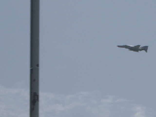 (↑航空自衛隊のF4戦闘機。左の棒状のものはアナウンス席の櫓の一部。いやあ飛行中を撮すのは難しいw)