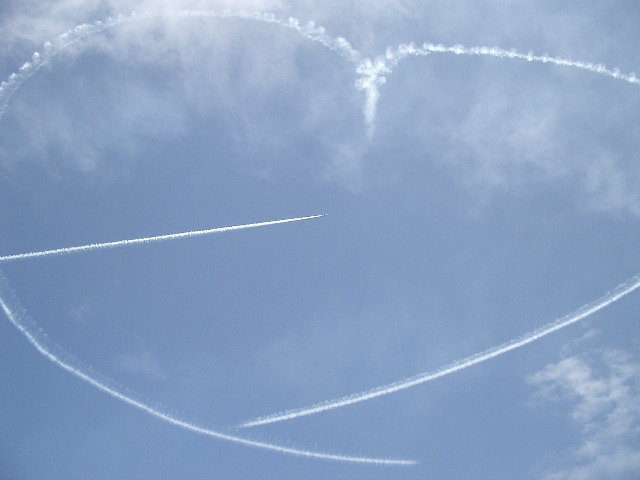 2機でハートマークを描き、1機が矢を描く。ブルーインパルスが得意とする洒落た大空の贈りもの。