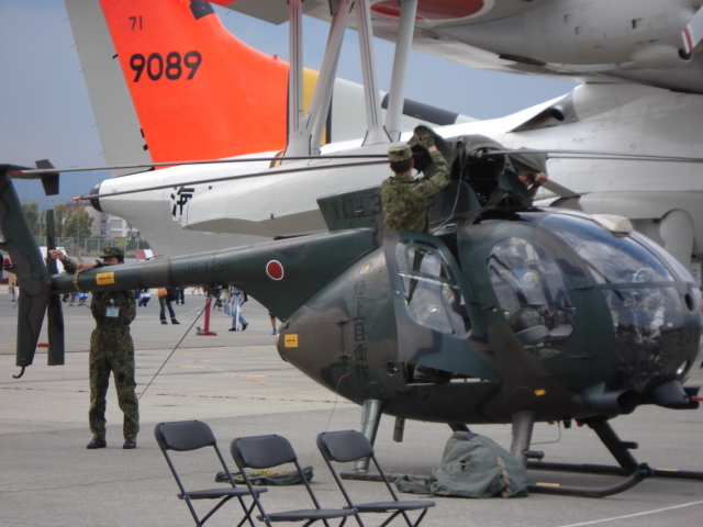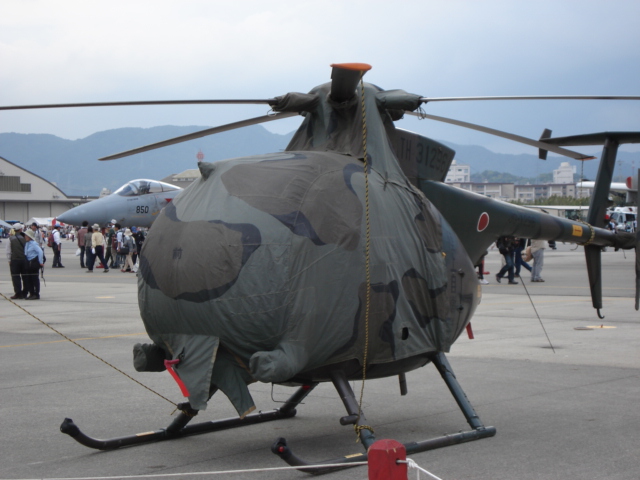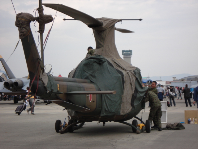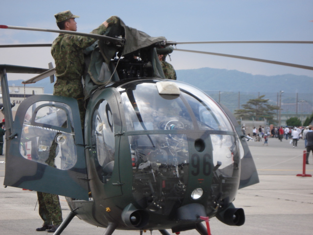 陸上自衛隊のOH-6観測ヘリ。隊員がシートをかけている。そしてそのがコクピットにシートで包まれた状態。