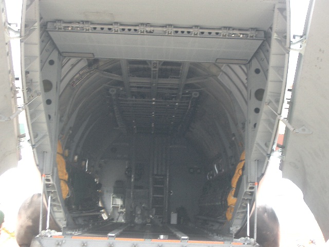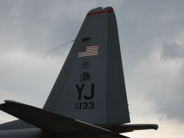 米軍のKC-KC130空中給油機。主翼の下に給油用のポッド(右側)あり、信号収納されたと給油ホースの先端が見える。